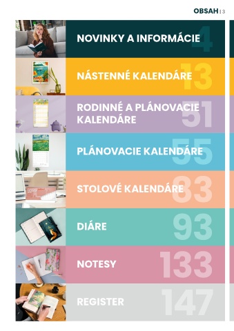 OBSAH | 3 4 NOVINKY A INFORMÁCIE 13 NÁSTENNÉ KALENDÁRE RODINNÉ A PLÁNOVACIE KALENDÁRE 51 55 PLÁNOVACIE KALENDÁRE 83 STOLOVÉ KALENDÁRE 93 DIÁRE 133 NOTESY 147 REGISTER