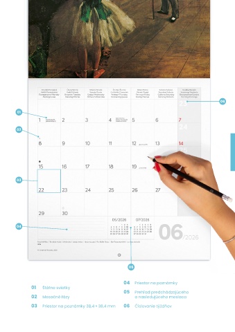 06 01 02 03 04 05 04 Priestor na poznámky 01 Štátne sviatky 05 Prehľad predchádzajúceho 02 Mesačné fázy a nasledujúceho mesiaca 03 Priestor na poznámky 38,4 × 38,4 mm 06 Číslovanie týždňov