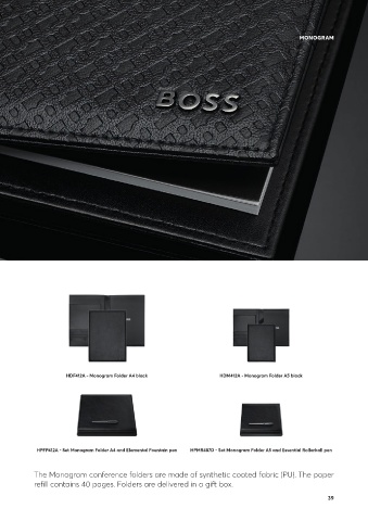 The Monogram conference folders are made of synthetic coated fabric (PU). The paper