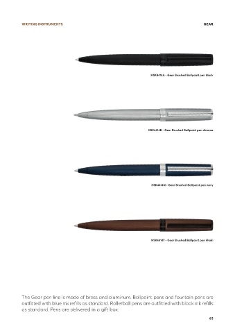 The Gear pen line is made of brass and aluminum. Ballpoint pens and fountain pens are