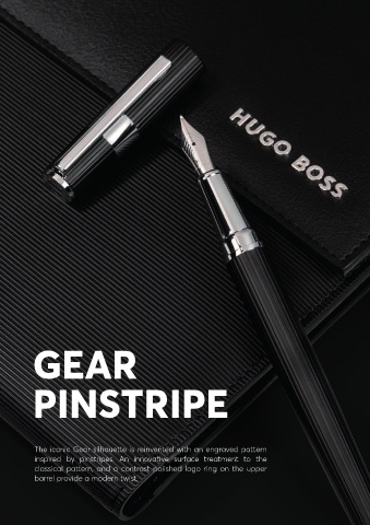 GEAR PINSTRIPE The iconic Gear silhouette is reinvented with an engraved pattern inspired by pinstripes. An innovative surface treatment to the classical pattern, and a contrast polished logo ring on the upper barrel provide a modern twist.