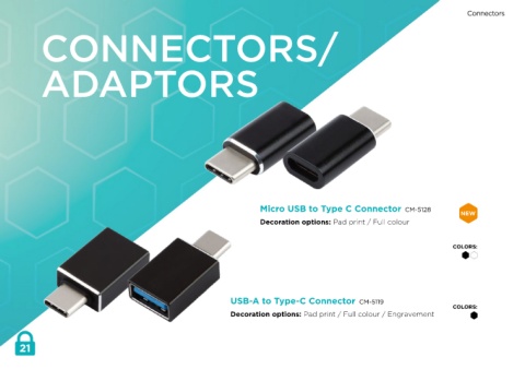 Connectors CONNECTORS/ ADAPTORS Micro USB to Type C Connector CM-5128 NEW Decoration options: Pad print / Full colour COLORS: USB-A to Type-C Connector CM-5119 COLORS: Decoration options: Pad print / Full colour / Engravement 21
