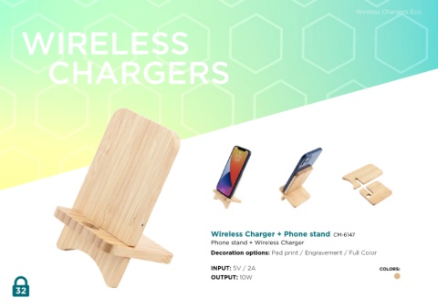 Wireless Chargers Eco WIRELESS CHARGERS Wireless Charger + Phone stand CM-6147 Phone stand + Wireless Charger Decoration options: Pad print / Engravement / Full Color INPUT: 5V / 2A COLORS: OUTPUT: 10W 32