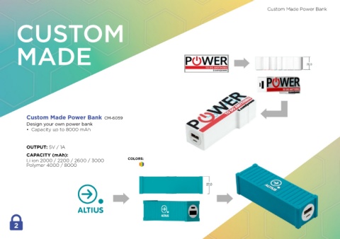 Custom Made Power Bank CUSTOM MADE Custom Made Power Bank CM-6059 Design your own power bank • Capacity up to 8000 mAh OUTPUT: 5V / 1A CAPACITY (mAh): Li ion 2000 / 2200 / 2600 / 3000 COLORS: Polymer 4000 / 8000 2