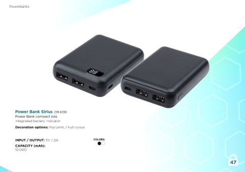 Powerbanks Power Bank Sirius CM-6139 Power Bank compact size Integrated battery indicator Decoration options: Pad print / Full colour INPUT / OUTPUT: 5V / 2A COLORS: CAPACITY (mAh): 10.000 47 47