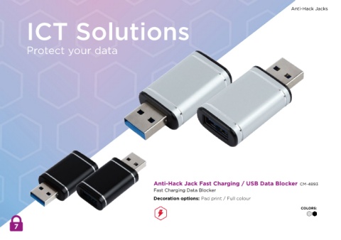 Anti-Hack Jacks ICT Solutions Protect your data Anti-Hack Jack Fast Charging / USB Data Blocker CM-4893 Fast Charging Data Blocker Decoration options: Pad print / Full colour COLORS: 7