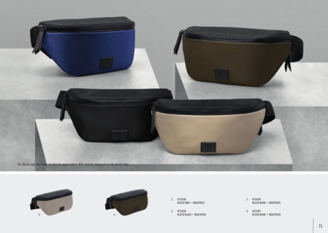 The Block bags are made of nylon & vegan leather (PU) and are delivered in non-woven bags. 1. NTJ328N 3. NTJ328X BLOCK NAVY • WAISTPACK BLOCK BEIGE • WAISTPACK 2. NTJ328A 4. NTJ328T 3. 4. BLOCK BLACK • WAISTPACK BLOCK KHAKI • WAISTPACK 71