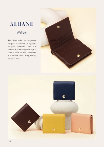 ALBANE Wallets The Albane wallets are the perfect compact accessories to organize all your essentials. Their soft textures & golden signatures give them a luxurious feel. Available in 4 vibrant tones : Navy, Yellow, Brown or Nude. 50