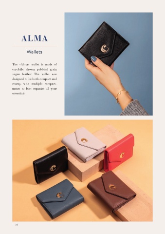 ALMA Wallets The «Alma» wallet is made of carefully chosen pebbled grain vegan leather. The wallet was designed to be both compact and roomy, with multiple compart- ments to best organize all your essentials . 70