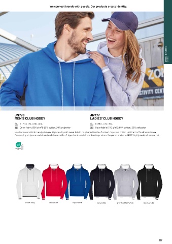 Contrasting stripes on waistband and sleeve cuffs • 2-layer hood inside in contrasting colour • Kangaroo pocket • JN777: lightly waisted, casual cut