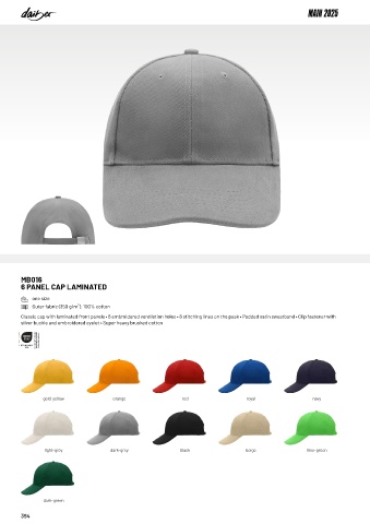 Classic cap with laminated front panels • 6 embroidered ventilation holes • 8 stitching lines on the peak • Padded satin sweatband • Clip fastener with