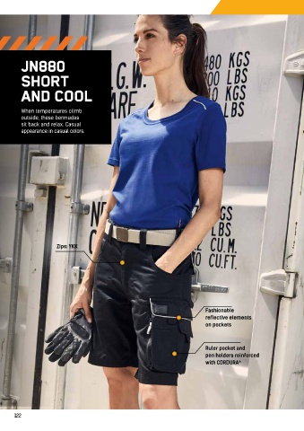 JN880 SHORT AND COOL When temperatures climb outside, these bermudas sit back and relax. Casual appearance in casual colors. Zips: YKK Fashionable reflective elements on pockets Ruler pocket and pen holders reinforced with CORDURA ® 122
