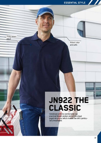 ESSENTIAL STYLE Finely woven piqué Ribbed collar and cuffs JN922 THE CLASSIC Convinces with its comfortable cut, practical breast pocket and a fine piqué piqué structure, which makes the shirt particu- larly breathable. 39