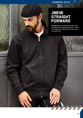 ESSENTIAL STYLE JN836 STRAIGHT FORWARD Straightforward, comfortable and hard-wear- ing. Ideal for temperatures for which a T-shirt is too light and a classic jacket is too much of a good thing. 49