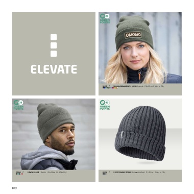 28 38676 | BOREAS BEANIE WITH PATCH | Acrylic | 19 x 23 cm | 0.154 kg CO 2 e 28 43 111043 | IRWIN BEANIE | Acrylic | 19 x 23 cm | 0.167 kg CO 2 e 38652 | IVES ORGANIC BEANIE | Organic cotton | 17 x 23 cm | 0.084 kg CO 2 e 108