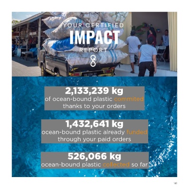 2,133,239 kg of ocean-bound plastic commited thanks to your orders 1,432,641 kg ocean-bound plastic already funded through your paid orders 526,066 kg ocean-bound plastic collected so far 141