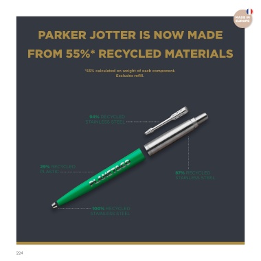 PARKER JOTTER IS NOW MADE FROM 55%* RECYCLED MATERIALS *55% calculated on weight of each component. Excludes refill. 94% RECYCLED STAINLESS STEEL 29% RECYCLED PLASTIC 87% RECYCLED STAINLESS STEEL 100% RECYCLED STAINLESS STEEL 224