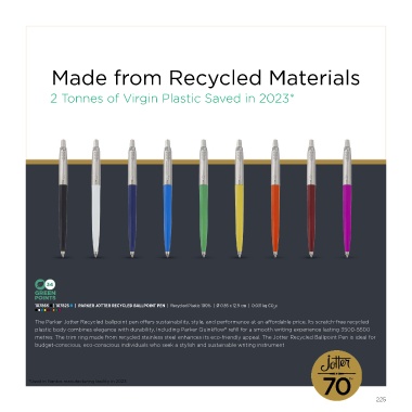 The Parker Jotter Recycled ballpoint pen o�ers sustainability, style, and performance at an a�ordable price. Its scratch-free recycled