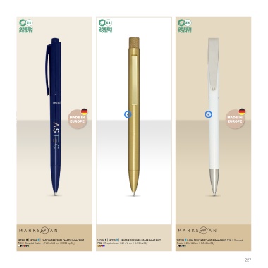 107929 | 107928 | MARTHA RECYCLED PLASTIC BALLPOINT 107918 | 107919 | BEATRIZ RECYCLED BRASS BALLPOINT 107930 | ANA RECYCLED PLASTIC BALLPOINT PEN | Recycled