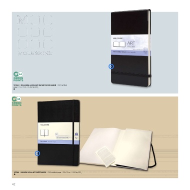 44 107954 | MOLESKINE LARGE ART WATER COLOUR ALBUM | FSC certified paper | 13 x 21 cm | 0.460 kg CO2 e 44 107955 | MOLESKINE A4 ART SKETCHBOOK | FSC certified paper | 29 x 21 cm | 1.190 kg CO2 e 42