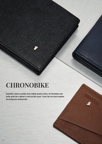 CHRONOBIKE Beautifully crafted in carefully chosen Saffiano genuine leathers, the Chronobike small leather goods line is offered in a new tone this season : Camel. This new shade completes the existing navy and black offer. 58