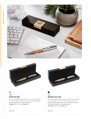 The front piece has a cork finish. Per set in a beautiful, matching giftbox. and a bamboo grip. The pen has a turn-click system. Presented in a