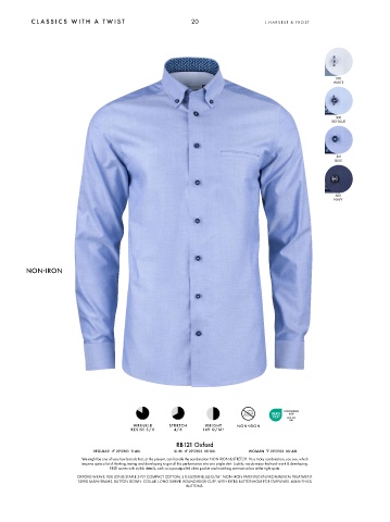OXFORD WEAVE. 95% LONG STAPLE 2-PLY COMPACT COTTON, 5 % ELESTANE,145 G/M². NON-IRON PATENTED ENVIRONMENTAL TREATMENT.