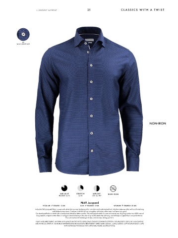 long stapled, compact cotton fabric. It will give natural elasticity to the shirt of up to 12% stretch the weft way, and still keep our great Non-iron performance.