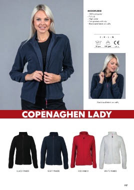 MICROFLEECE - 100% polyester - Full zip - High collar - Two pockets with zip - Elasticized fabric on cuffs S - M - L - XL 25 pcs 180 g/m² CAT 1 Elasticized fabric on cuffs COPENAGHEN LADY BLACK 994811 NAVY 994810 RED 994813 WHITE 994812 157