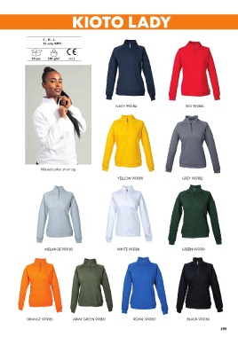 KIOTO LADY S - M - L XL only NAVY 20 pcs 280 g/m² CAT 1 NAVY 993184 RED 993186 Ribbed collar, short zip YELLOW 993190 GREY 993182 MELANGE 993183 WHITE 993188 GREEN 993189 ORANGE 993185 ARMY GREEN 993181 ROYAL 993187 BLACK 993180 209