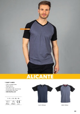 WORK ALICANTE T-SHIRT V-NECK - 100% combed cotton - Raglan sleeve - Low neck 1.2 cm - Contasting collar and sleeves - Contrasting collar tape - Individually sold S - M - L - XL - XXL - 3XL 100 pcs 150 g/m² CAT 1 NAVY 992560 GREY 992561 385