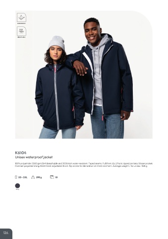 100% polyamide. 5000 gsm/24h breathable and 3000 mm water-resistant. Taped seams. Full front zip. 2 front zipped pockets. 1 inner pocket.