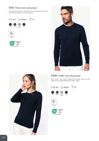 50% cotton / 50% acrylic. Fitted style. Double layer neck rib. Taped