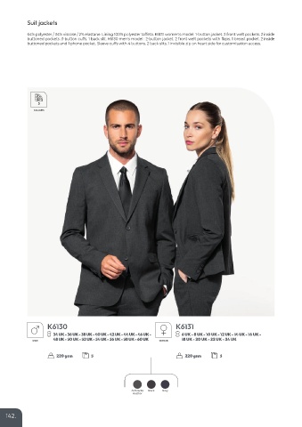 buttoned pockets. 3-button cuffs. 1 back slit. K6130 men's model : 2-button jacket. 2 front welt pockets with flaps. 1 breast pocket. 2 inside