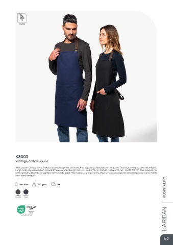 100% cotton. Canvas fabric. Metal buckle with eyelets at the neck for adjusting the length of the apron. Tie straps in coated decorative fabric.