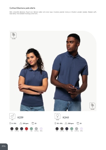 95% cotton/5% elastane. Piqué knit. Ribbed collar with neck tape. 3-button placket (men) or 2-button placket (ladies). Ribbed cuffs.