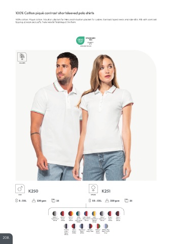 100% cotton. Piqué cotton. 3-button placket for Men and 5-button placket for Ladies. Contrast taped neck and side slits. Rib with contrast