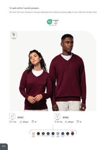 50% cotton / 50% acrylic. 12 gaude knit. Fitted style. Double layer neck rib. Taped neck. Average weight L for men's : 362 g and M for ladies' : 298 g