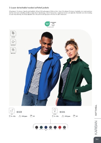 95% polyester / 5% elastane. 3-layer bonded breathable 1000 g/m2/24h and waterproof 5000 mm fabric. Outer: 95% polyester/5% elastane. Breathable, micro-mesh membrane