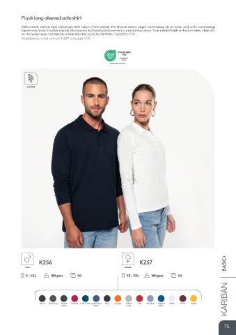 100% cotton. Oxford Grey colourway: 90% cotton / 10% viscose. Pre-shrunk cotton piqué. Contrasting rib on collar and cuffs. Contrasting