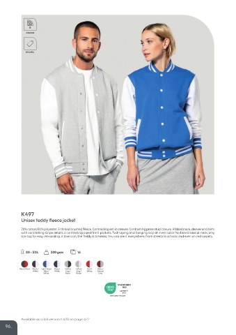 70% cotton/30% polyester. 3-thread brushed fleece. Contrasting set-in sleeves. Contrasting press stud closure. Ribbed neck, sleeves and hem