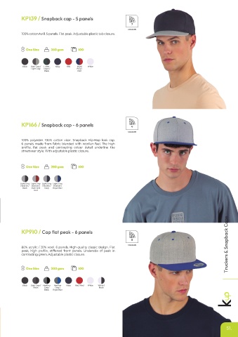 100% cotton twill. 5 panels. Flat peak. Adjustable plastic tab closure.