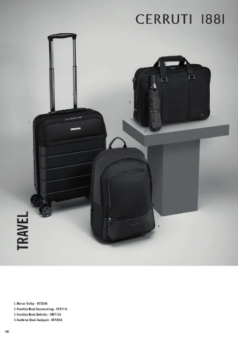 2 1 3 TRAVEL 4 1. Mercer Trolley - NTT854A 2. Hamilton Black Document bag - NTD711A 3. Hamilton Black Umbrella - NUF711A 4. Heathrow Black Backpack - NTP205A 48