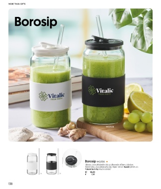 MORE THAN GIFTS Borosip MO2506 Borosip MO2506 Sklenice z borosilikátového skla se silikonovým víčkem a úchytem. Včetně brčka z borosilikátového skla. Objem: 550 ml. Rozměry Ø7x15 cm Tiskové techniky Rotační sítotisk,P Kč 186,80 06 03 € 7,47 138