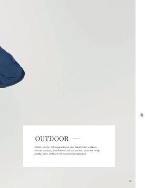OUTDOOR Softshell = špeciálny materiál pre outdoorové odevy. Charakteristická kombinácia vlastností, ako sú vodeodolnosť, odolnosť proti vetru, pružnosť a priedušnosť, zaisťuje pohodlie a voľnosť pohybu v rôznych poveternostných podmienkach. 146 147