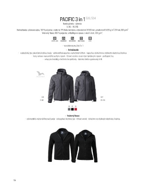 Vrchná bunda: plátnová väzba, 100 % polyester, vnútorná TPU biela laminácia, vodeodolnosť 8 000 mm, priedušnosť 5 000 g/m/24 hod, 130 g/m Softshell: 94 % polyester, 6 % elastan; TPU membrána;