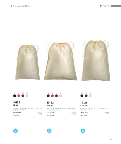 80 g/m² TNT gift bag, 30 x 45 cm. • Pochon TNT 80 g/m² TNT gift bag, 40 x 50 cm. • Pochon TNT 80 g/m² TNT gift bag, 50 x 75 cm. • Pochon TNT
