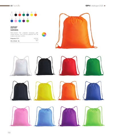 01 catalogue 2025 01 02 03 04 05 06 07 10 12 15 35 44 22137 GARDENA Plain-colored 210T polyester backpack with choker closure. • Sac à dos en polyester 210T de couleur unie avec cordons. Polyester 210T 50/250 35 x 42 cm - 6L 130