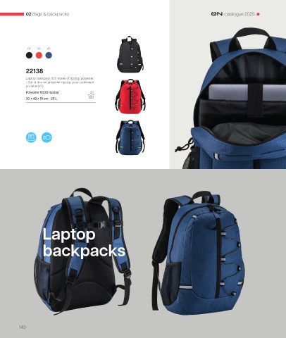 02 Bags & backpacks catalogue 2025 02 03 05 22138 Laptop backpack (15”) made of ripstop polyester. • Sac à dos en polyester ripstop pour ordinateur portable (15”) Polyester 600D ripstop 20 30 x 43 x 18 cm - 23 L Laptop backpacks 140