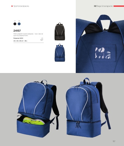 Sports backpacks 02 Bags & backpacks 02 05 24157 600D polyester sports backpack. • Sac à dos de sport en polyester 600D. Polyester 600D 20 33 x 48 x 29 cm - 46 L 157